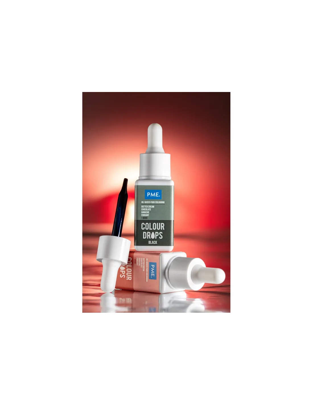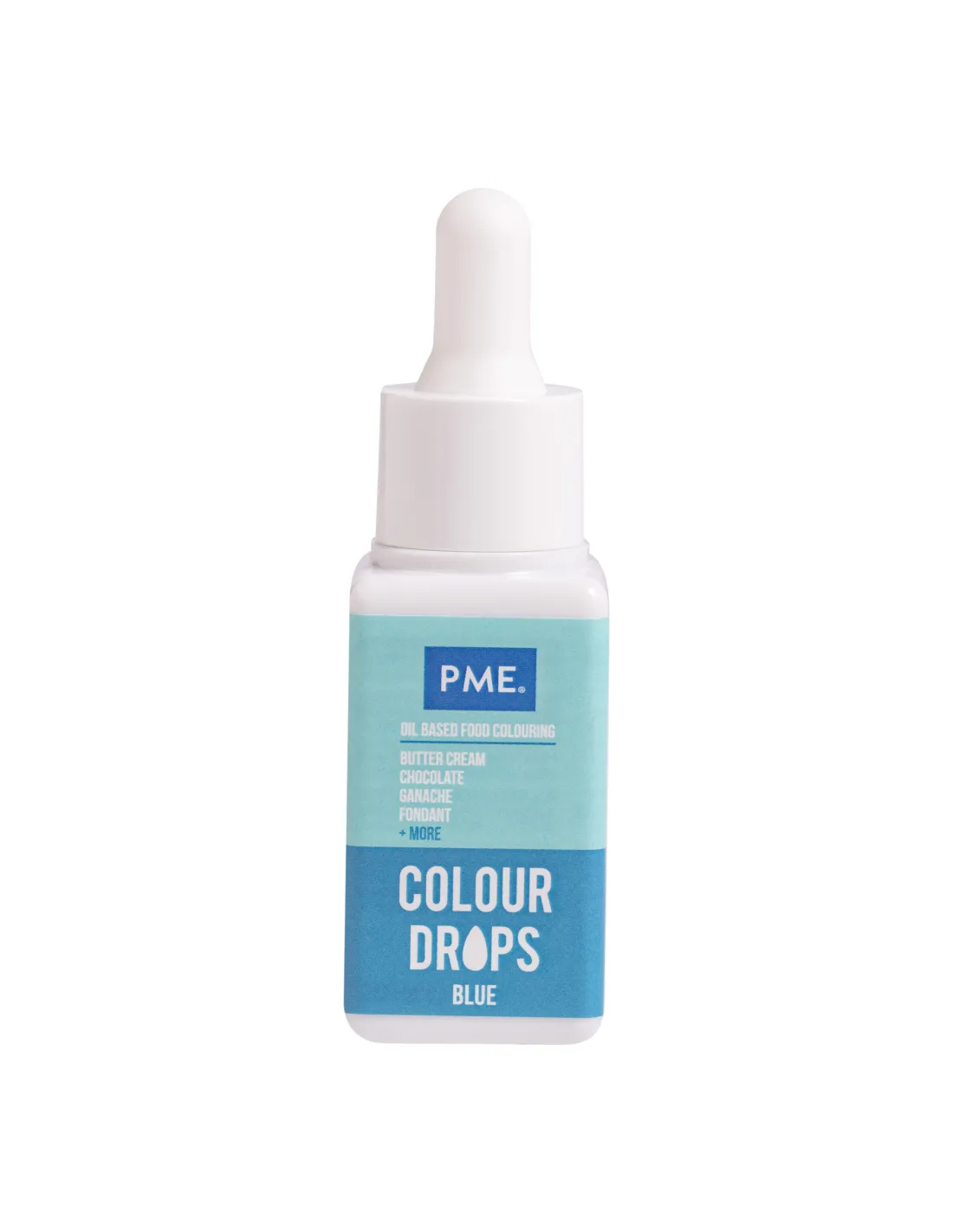 Las PME Colour Drops azules están especialmente formuladas con una mezcla de aceites que se adapta perfectamente a la mantequilla, garantizando una mezcla vibrante y homogénea en buttercream, chocolate, ganache, fondant y masa para pastel.