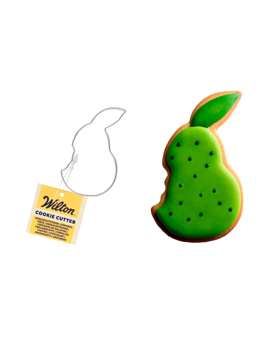 Cortador de galletas con forma de pera mordida, fabricado en acero inoxidable.