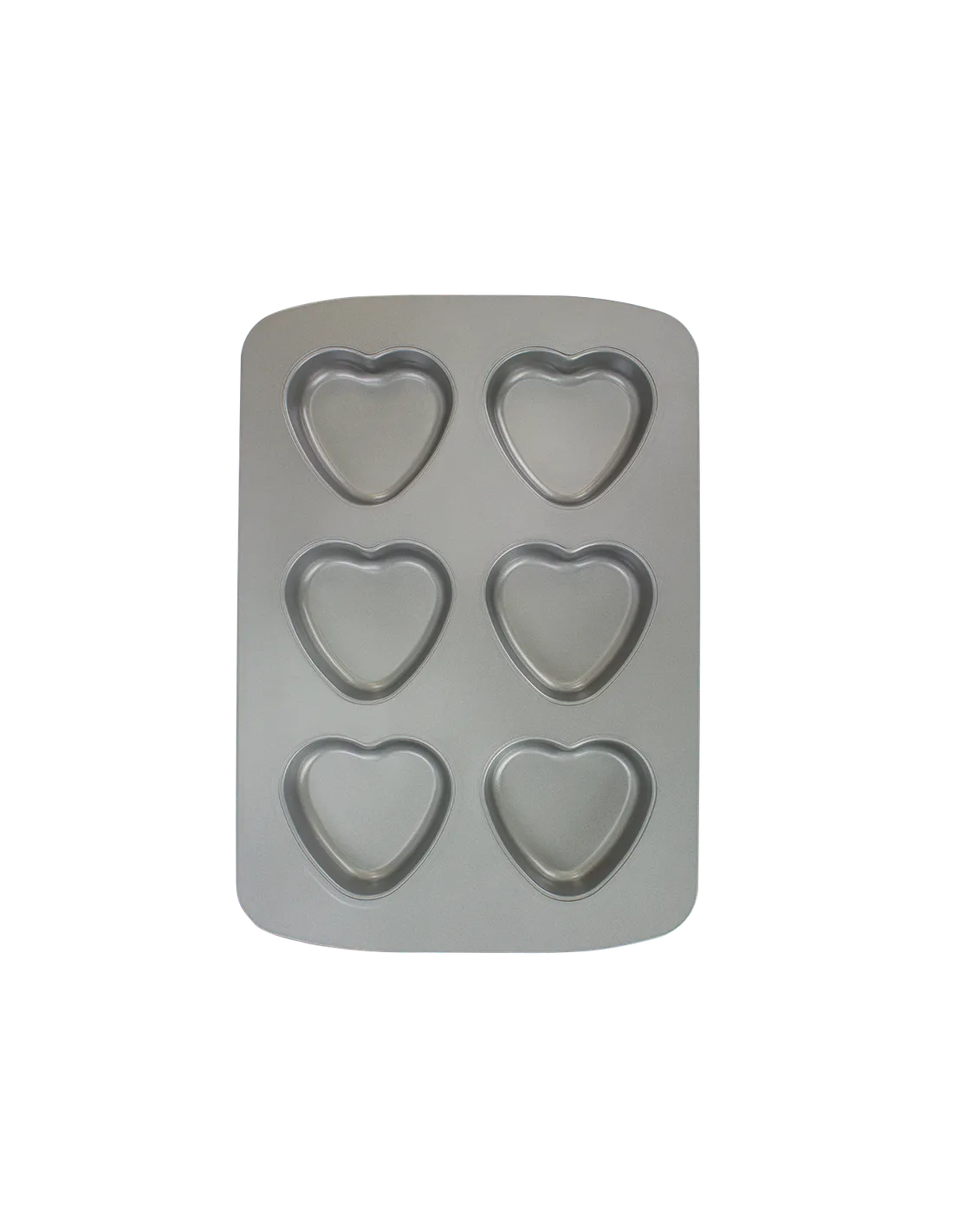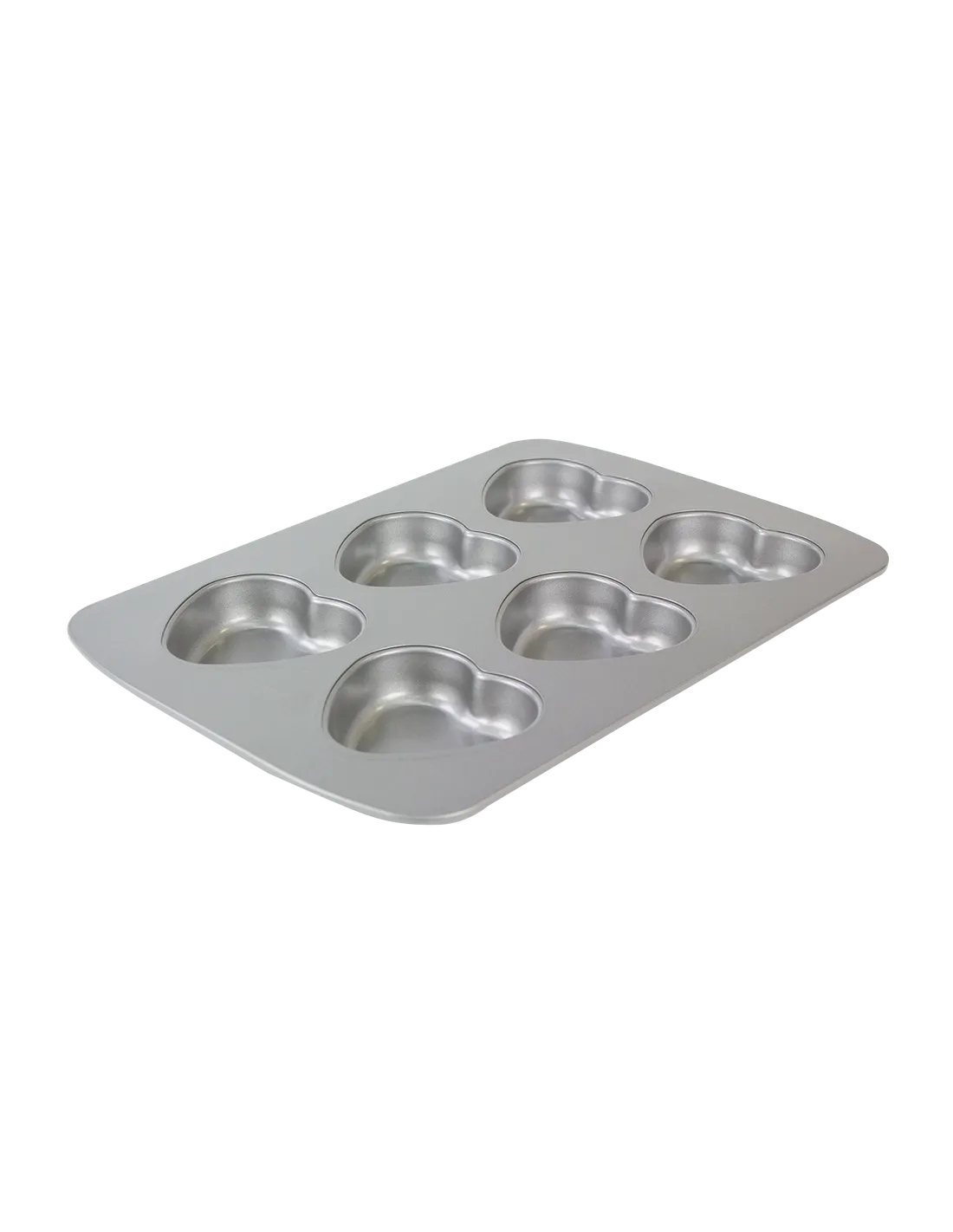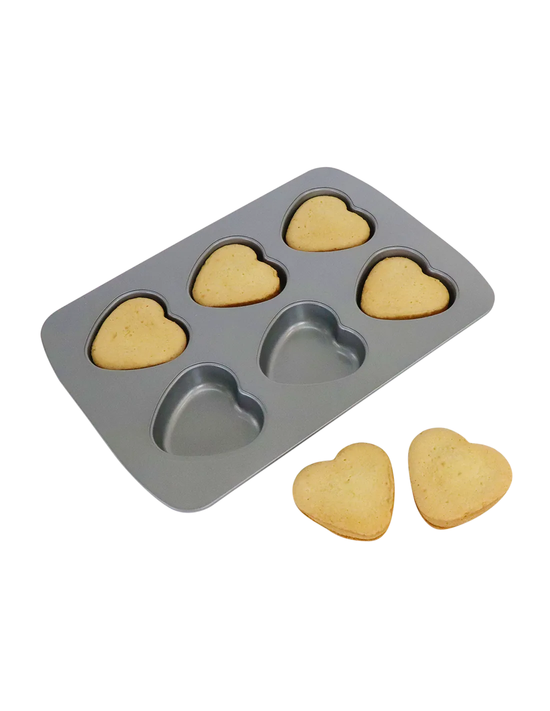 Molde antiadherente, para hornear 6 corazones, fabricado en acero al carbono de primera calidad.