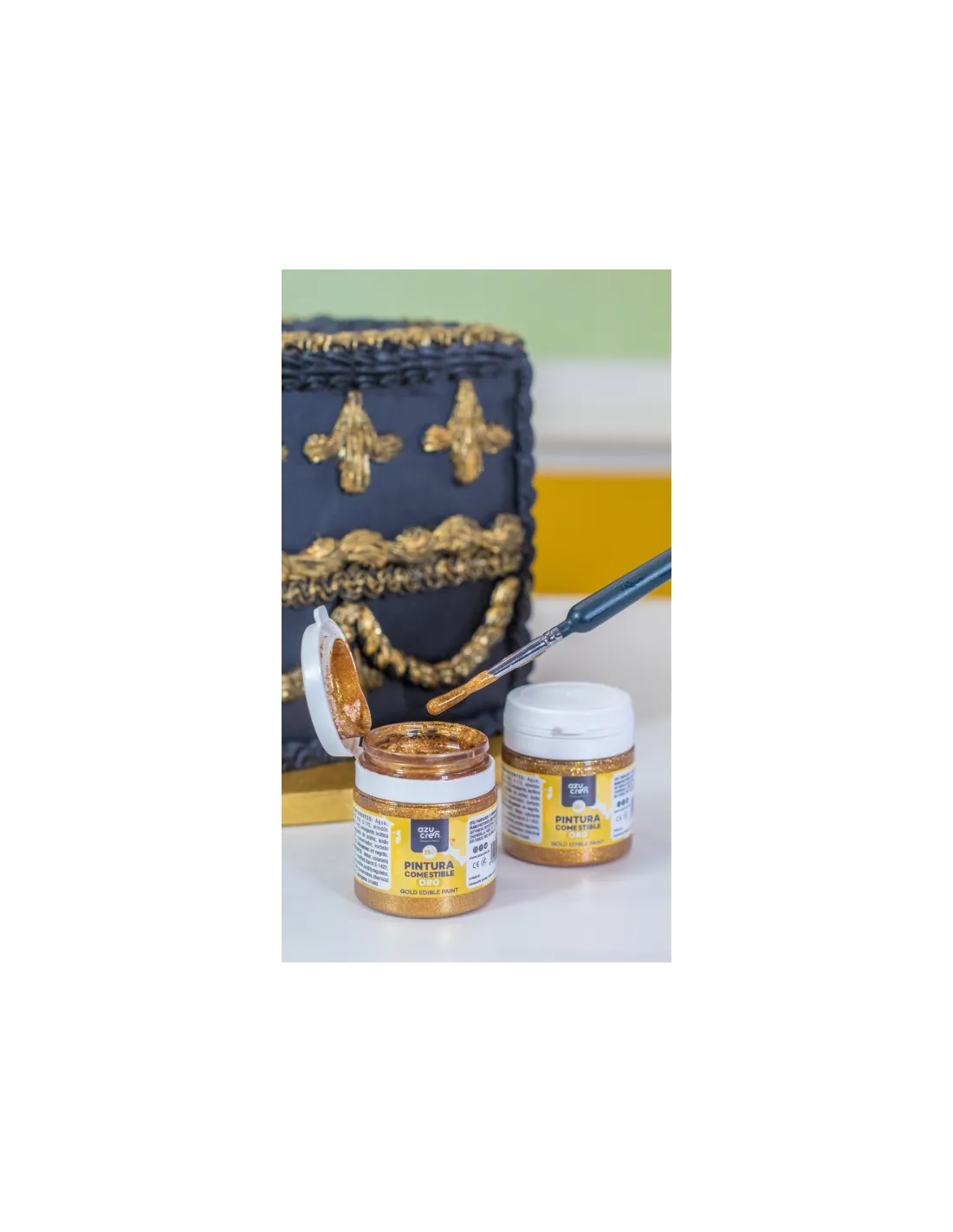 Pintura metálica oro con la que podrás crear bonitas decoraciones en fondant, mazapán, pasta de goma, glasa real y mucho más.