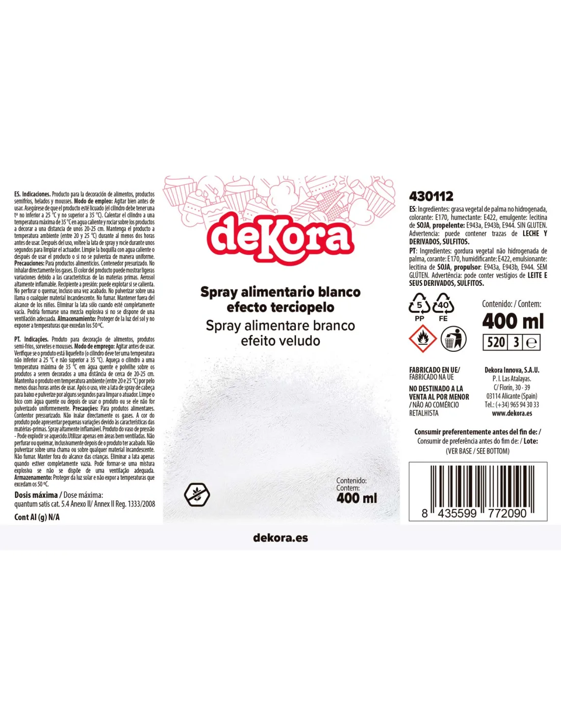 Modo de empleo: agitar bien antes de usar. Asegúrese de que el producto esté licuado (el bote debe tener una temperatura entre 25-35ºC). Calentar el bote a una temperatura máxima de 35ºC para derretir la manteca de cacao y rociar sobre los productos a decorar. Mantenga el producto a temperatura ambiente (entre 20 y 25ºC) durante al menos 2 horas antes de usar. Después del uso, voltee el bote de spray y rocíe durante unos segundos para limpiar el actuador. Limpie la boquilla con agua caliente o después de usar el producto o si no se pulveriza de manera uniforme.
