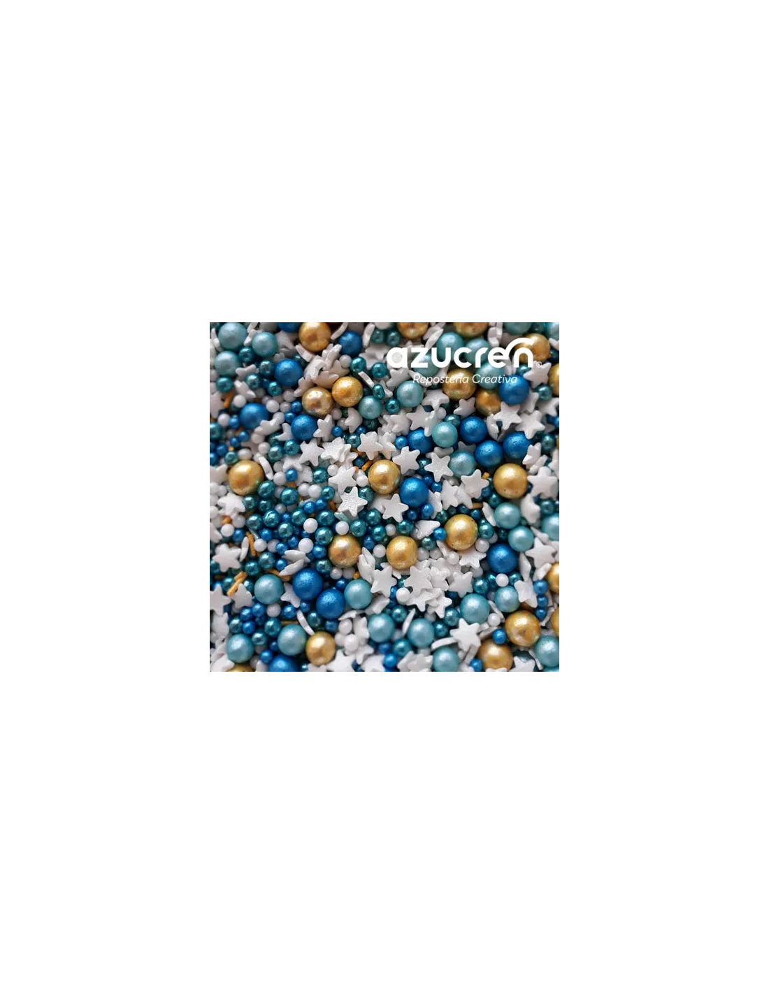 Contiene: Fideos turquesas y oro metalizado. Perlas 4 mm blancas, azules y azul metalizado. Estrellas blancas. Perlas 6 mm oro metalizado.Perlas 7 mm azules y turquesas.